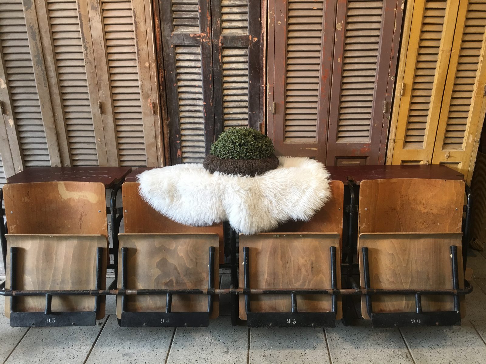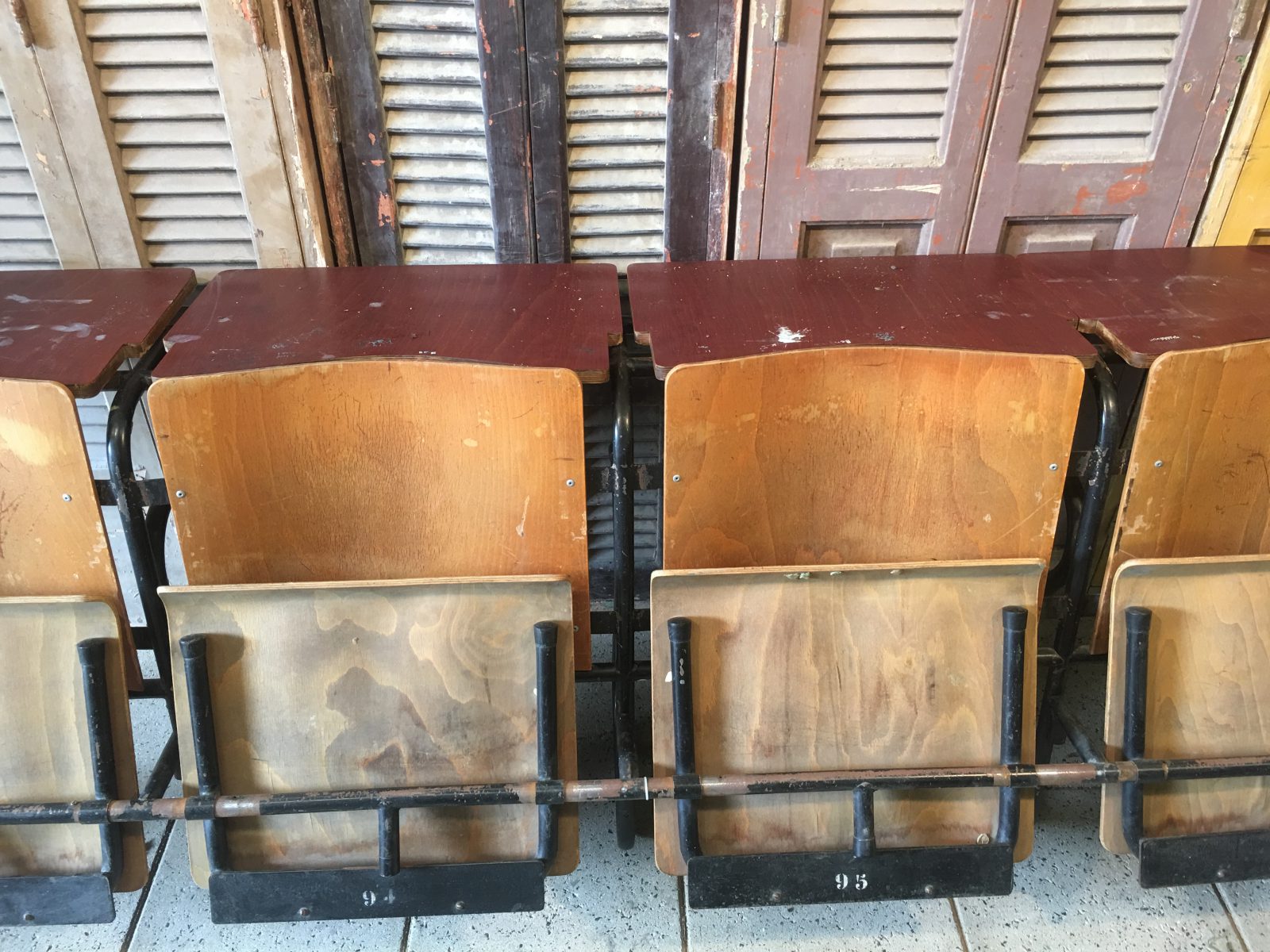 Authentiek en origineel houten inklapbaar schoolbankje met achter de stoel een schrijftafeltje. Leverbaar als drie en als vier zits. Prijs gaat per zitting. 25 euro per zitting.