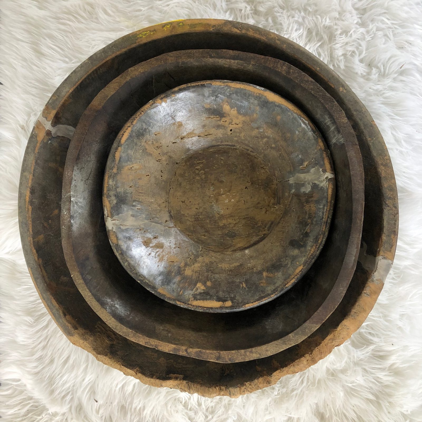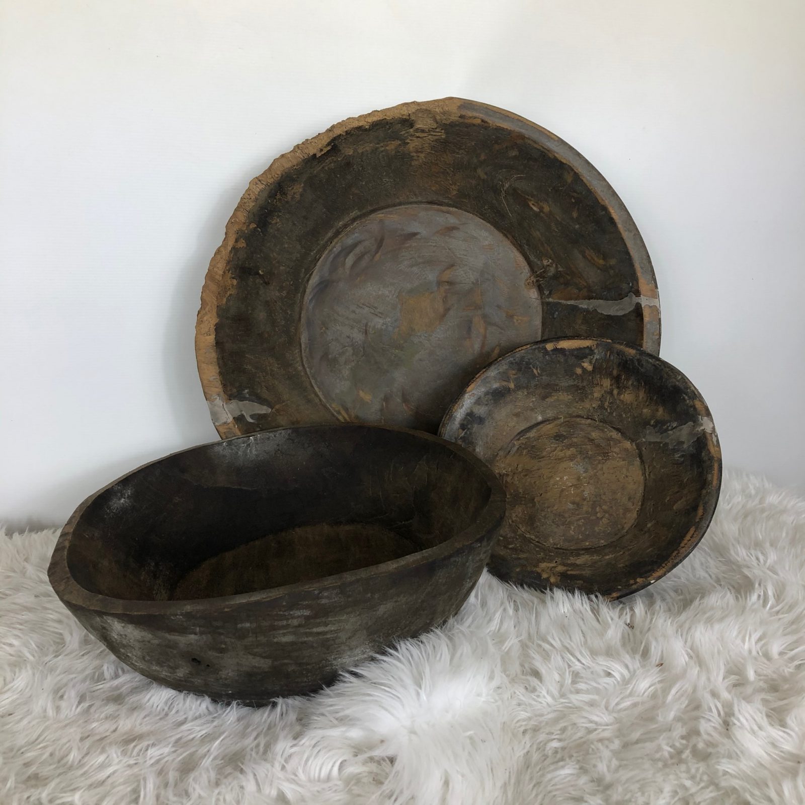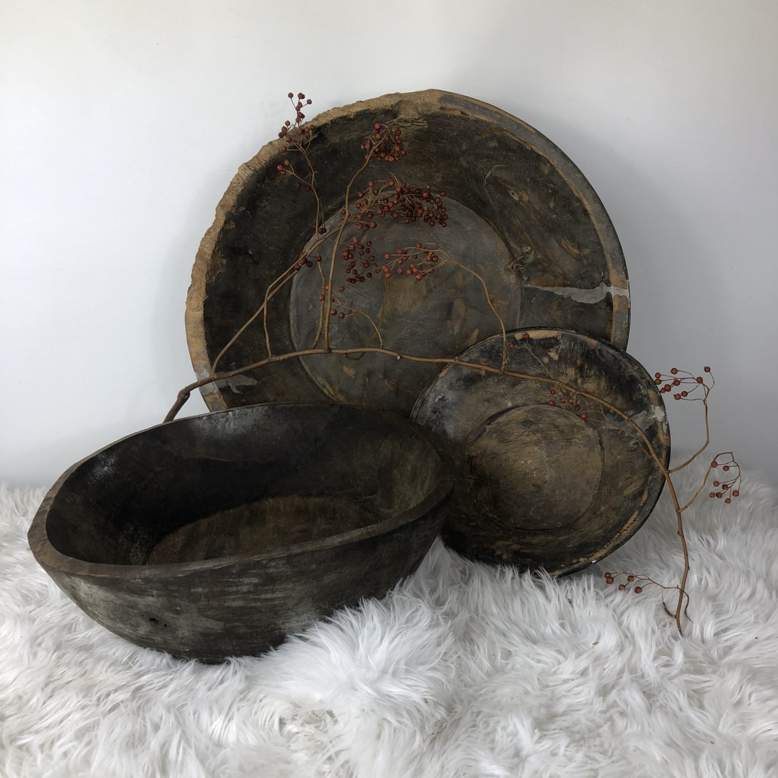 Hele stoere oude houten schalen in twee maten leverbaar.