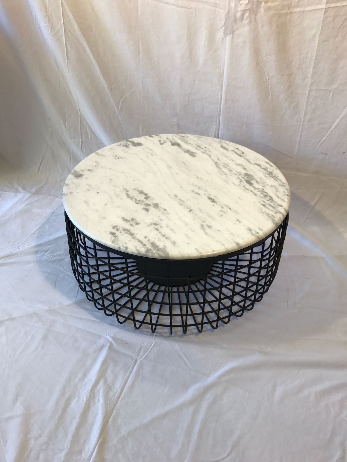 Ronde salontafel met een zwart metalen onderstel en marmeren blad.