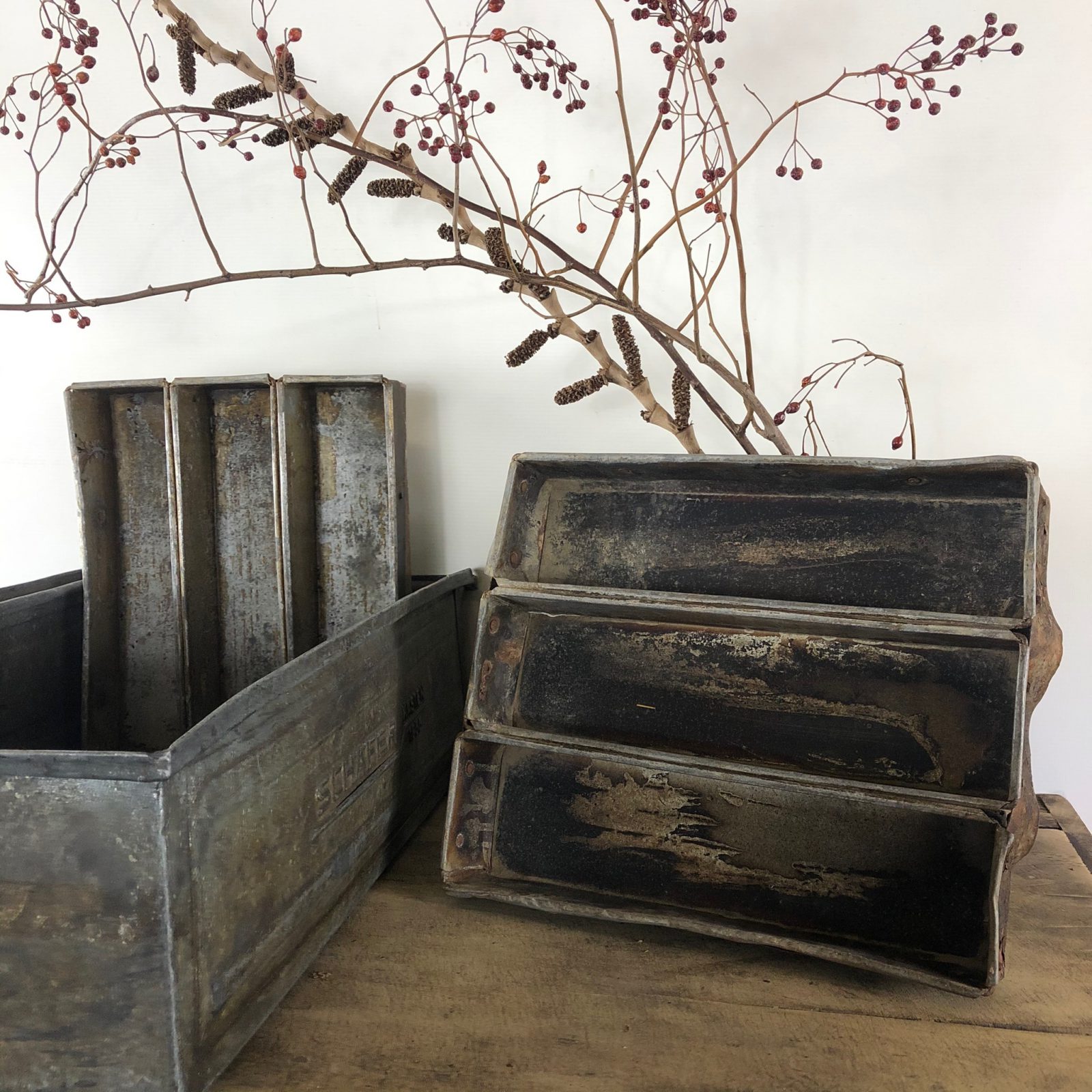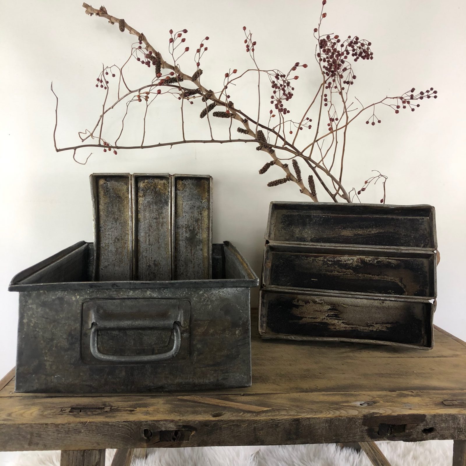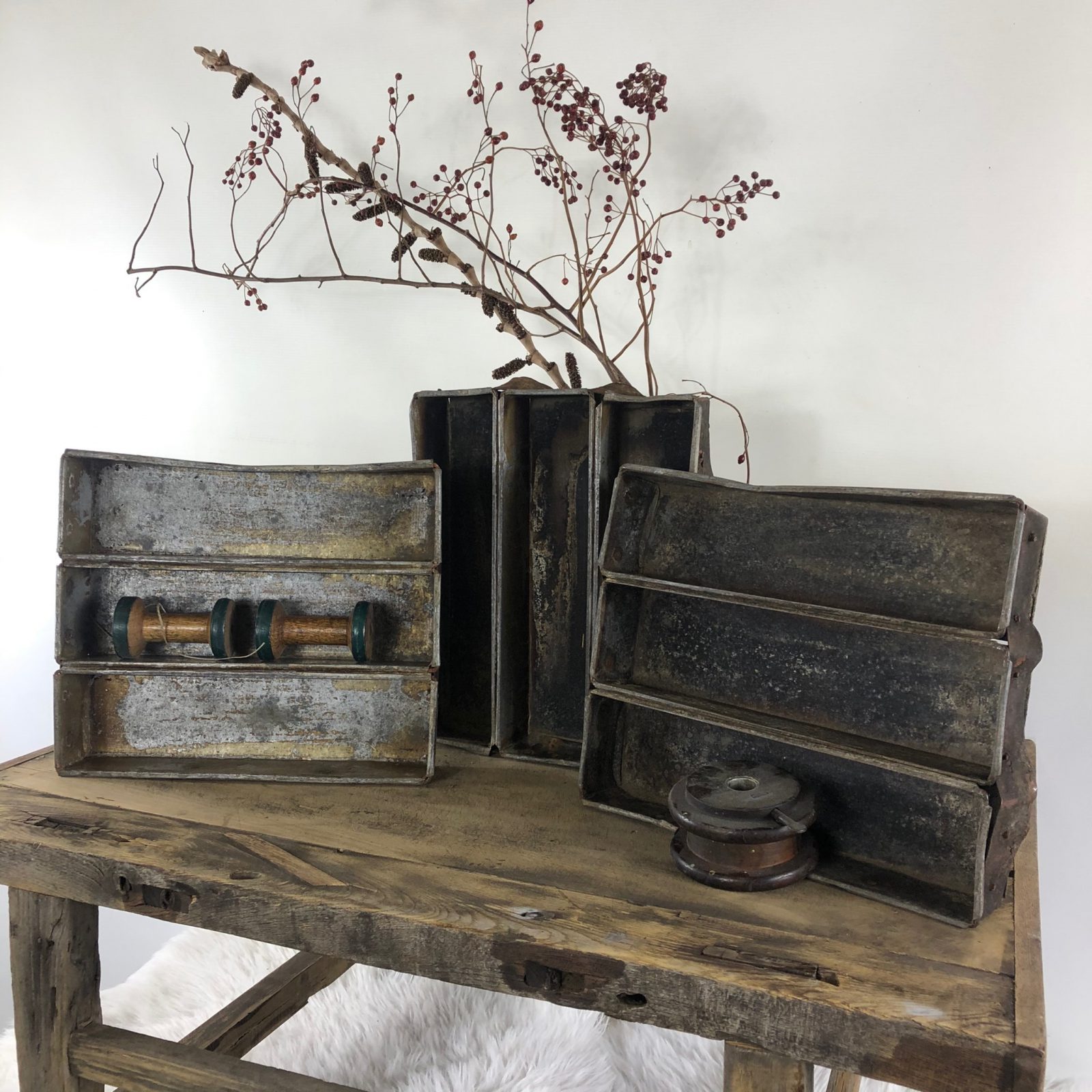Leuke zinken (bestek)bakken met 3 vakken. Fraai voor in de landelijke keuken. Afmeting 33 cm x 28 cm