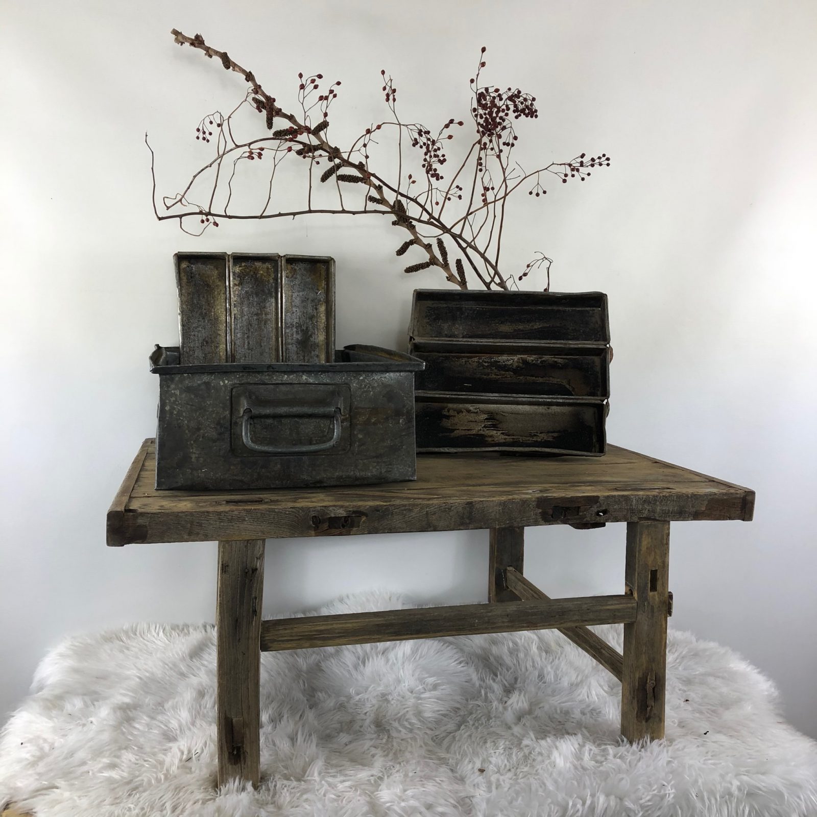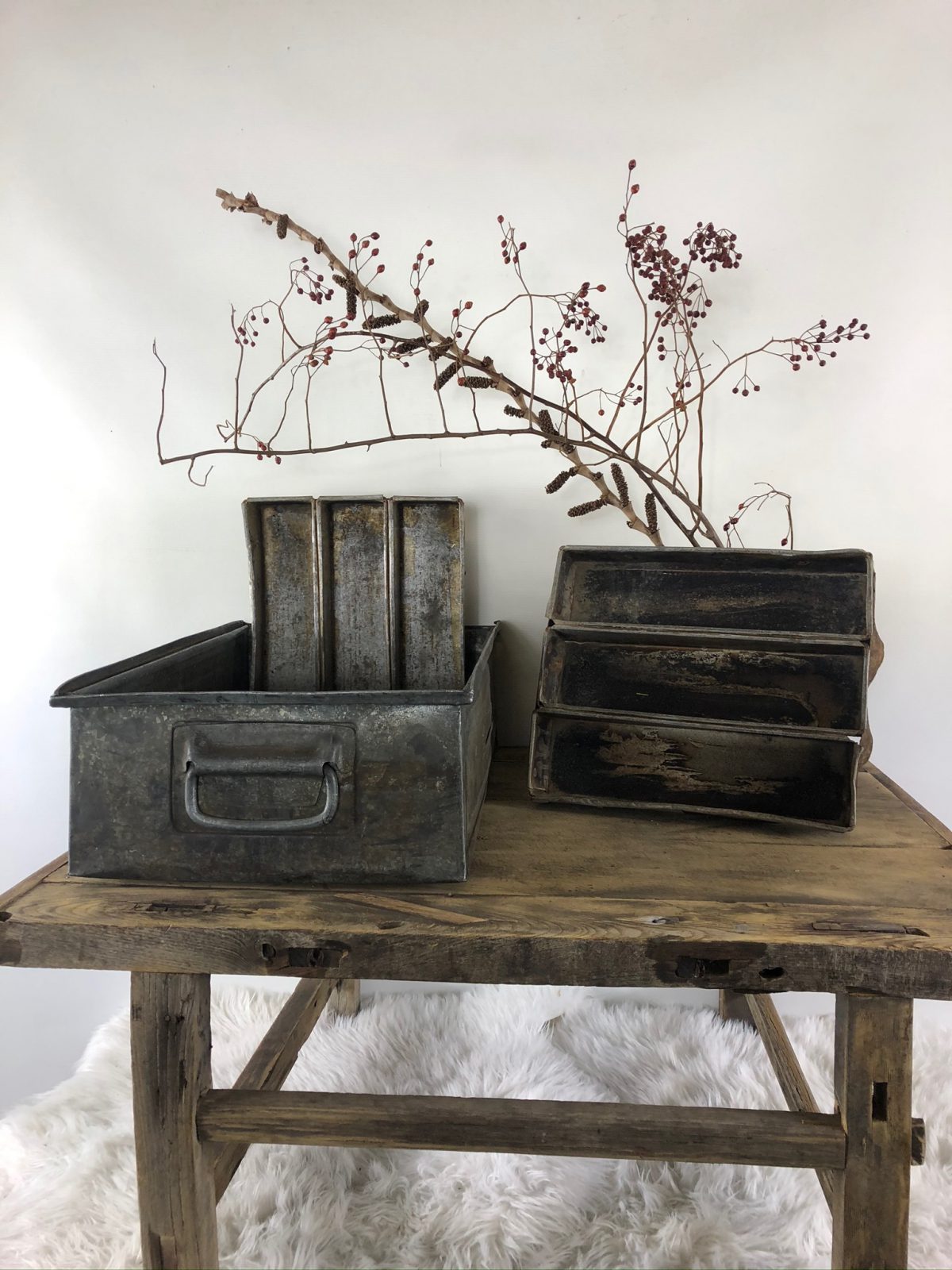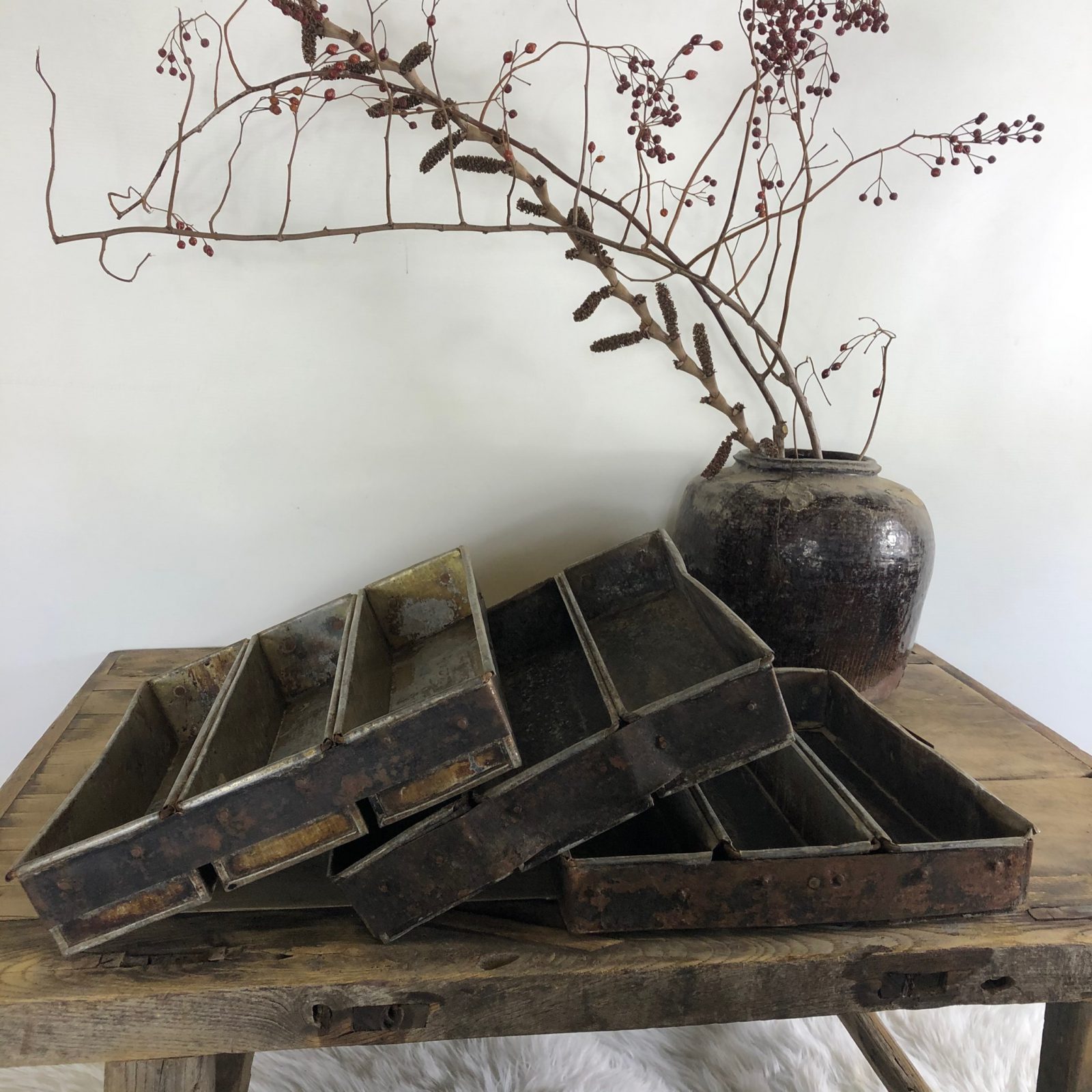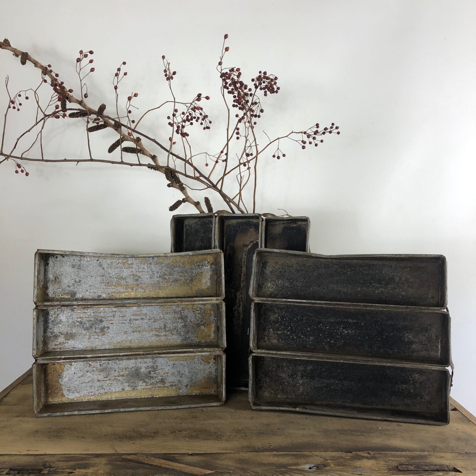 Leuke zinken (bestek)bakken met 3 vakken. Fraai voor in de landelijke keuken. Afmeting 33 cm x 28 cm